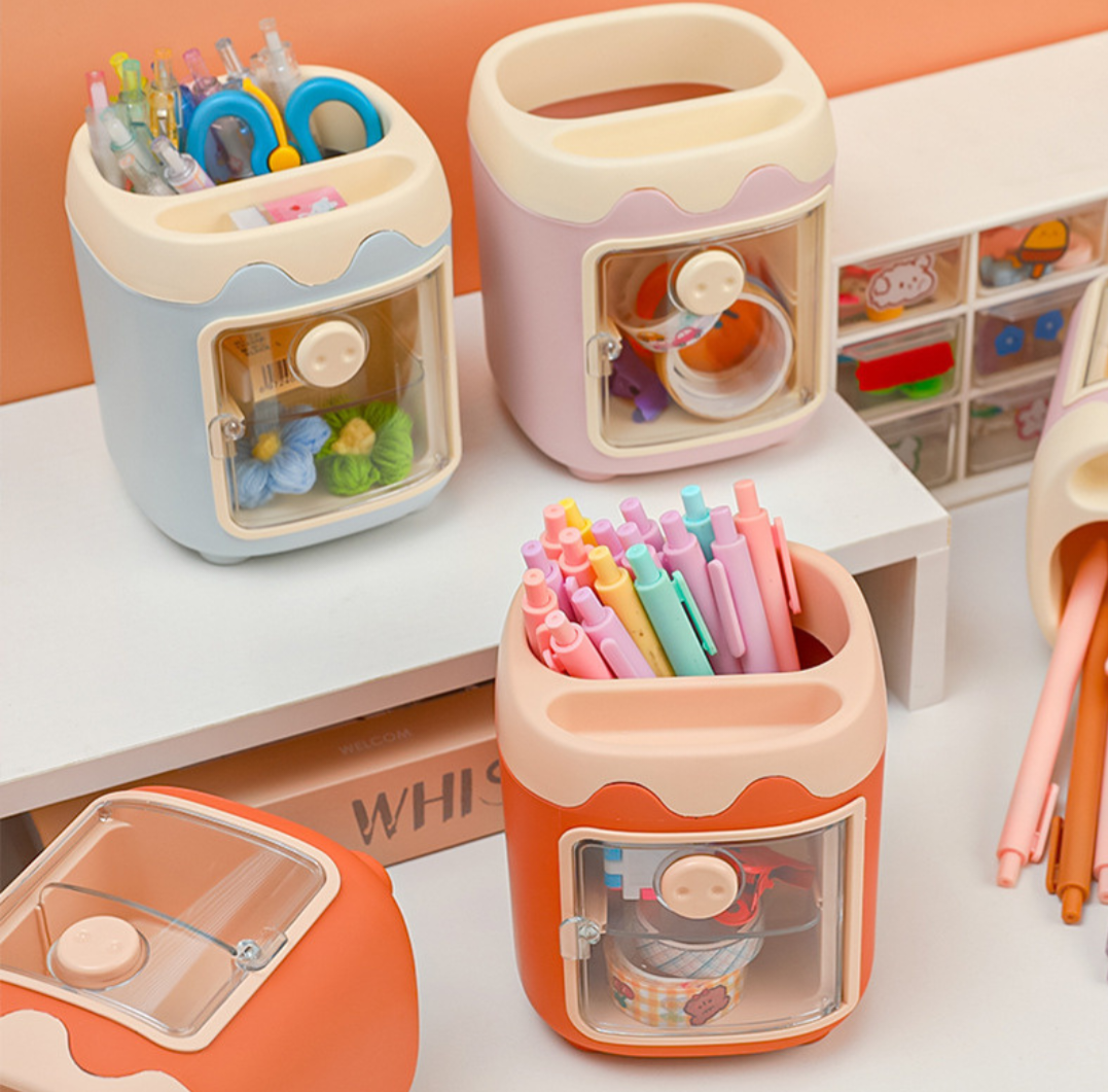 Discover a new way to organize your stationery with the Pig Nose Pen Stand. This quirky pen stand features a unique cube design and a small transparent door to store small supplies like erasers, paper clips, and sharpeners. The adorable pig nose design adds a fun touch to your desk while keeping your items within reach.