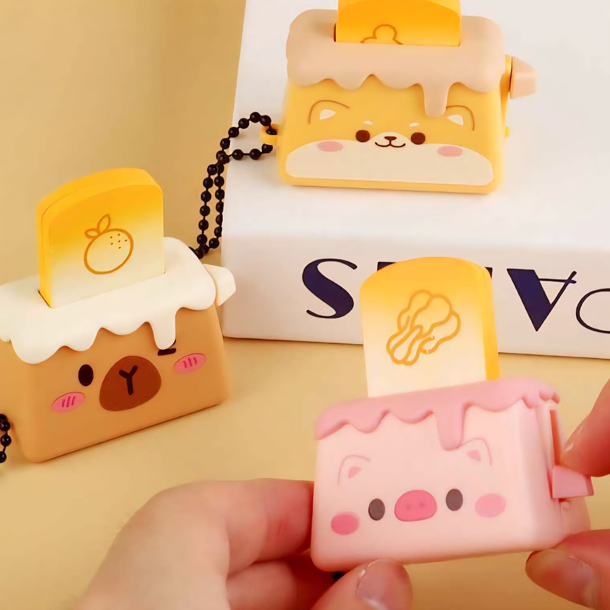 Press the lever and watch the toast pop—a delightful fidget keychain that combines playful mechanics with kawaii charm. Each toaster features adorable animal characters, with matching details on the pop-up toast for extra cuteness. Perfect for fidgeting on the go, this miniature toaster delivers satisfying tactile feedback with every press. A whimsical accessory that brings joy to your keys, bag, or desk.